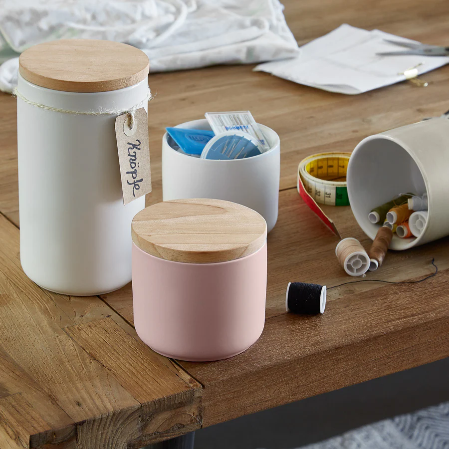 Keramik Vorratsdosen Sweet Scandi mit Holzdeckel - 10,1 x 18,3 cm - Rosa/Braun