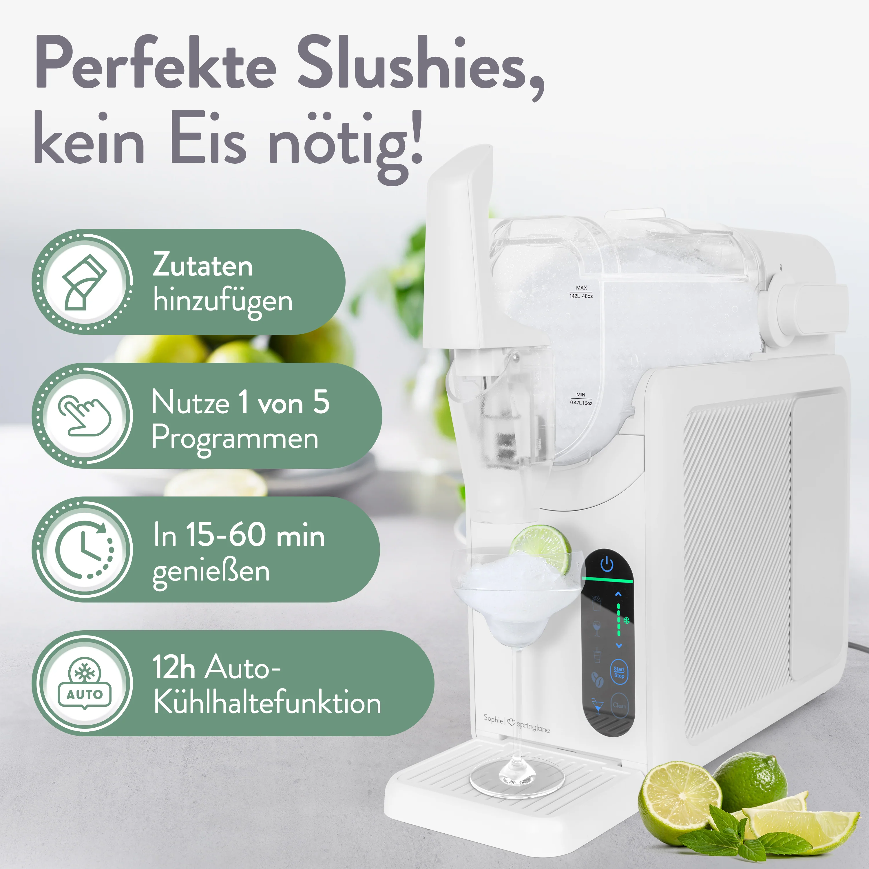 Eisgekühlte Erfrischung für Zuhause – einfacher als je zuvor. Wer kennt es nicht? Die Lust auf einen eiskalten Slushie, einen cremigen Milchshake oder einen erfrischenden Cocktail an einem warmen Tag. Doch die Zubereitung zu Hause ist oft umständlich... bis jetzt. Die Springlane Slush Maschine bringt das authentische Bar-Erlebnis direkt in die eigene Küche, ganz ohne Vorkenntnisse oder komplizierte Vorbereitung. Vielseitigkeit trifft auf innovative Technik - dank der 5-in-1 Funktion ist dieses Gerät ein wahres Multitalent. Ob Slush, Cocktail, Frappé, Milchshake oder Weinslush – die gewünschte Spezialität ist in wenigen Minuten fertig.