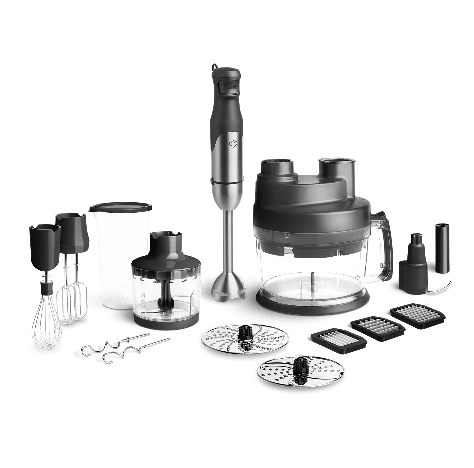 - Lieferumfang mit Küchenmaschine: Stabmixer Sam, Pürierstab-Aufsatz, Behälter mit Deckel, Zerkleinerer-Aufsatz mit Behälter, Schneebesen-Aufsatz, Rühr- und Knethaken, Küchenmaschine inkl. Aufsätze, Aufbewahrungstasche und Rezeptheft
